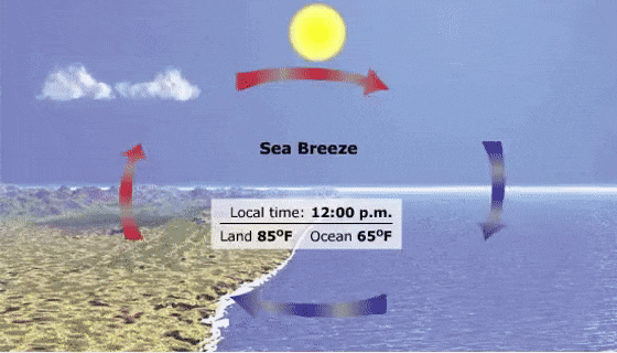 sea breeze는 해풍으로 , 주간에 작용한다. 주간에 태양에 의한 복사열로 육지가 수면보다 온도가 급격하게 상승하게 되어, 육지의 기압이 낮아져 바다에서 육지로 부는 바람이다.