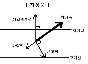 지상풍은 surface wind로 , 지상에서 1km 이내에서 부는 바람이다. 지상의 건축물 등으로 마찰력이 발생해 등압선과 평행하게 불지 않는다.