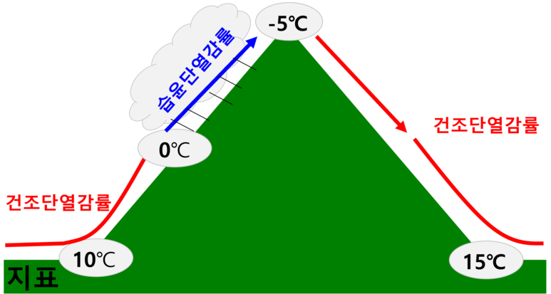 - 차고 건조한 공기가 경사면을 따라 하강하면서 덥고 습한 공기가 된다 .