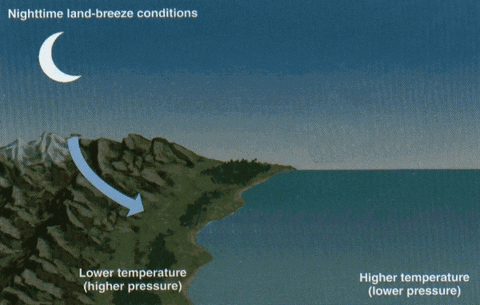land breeze는 육풍으로 , 야간에 작용한다. 비열의 차이로 인해 야간에 육지가 수면보다 빠르게 식으므로 , 육지의 기압이 낮아져 , 육지에서 바다쪽으로 불어 나가는 바람이다.