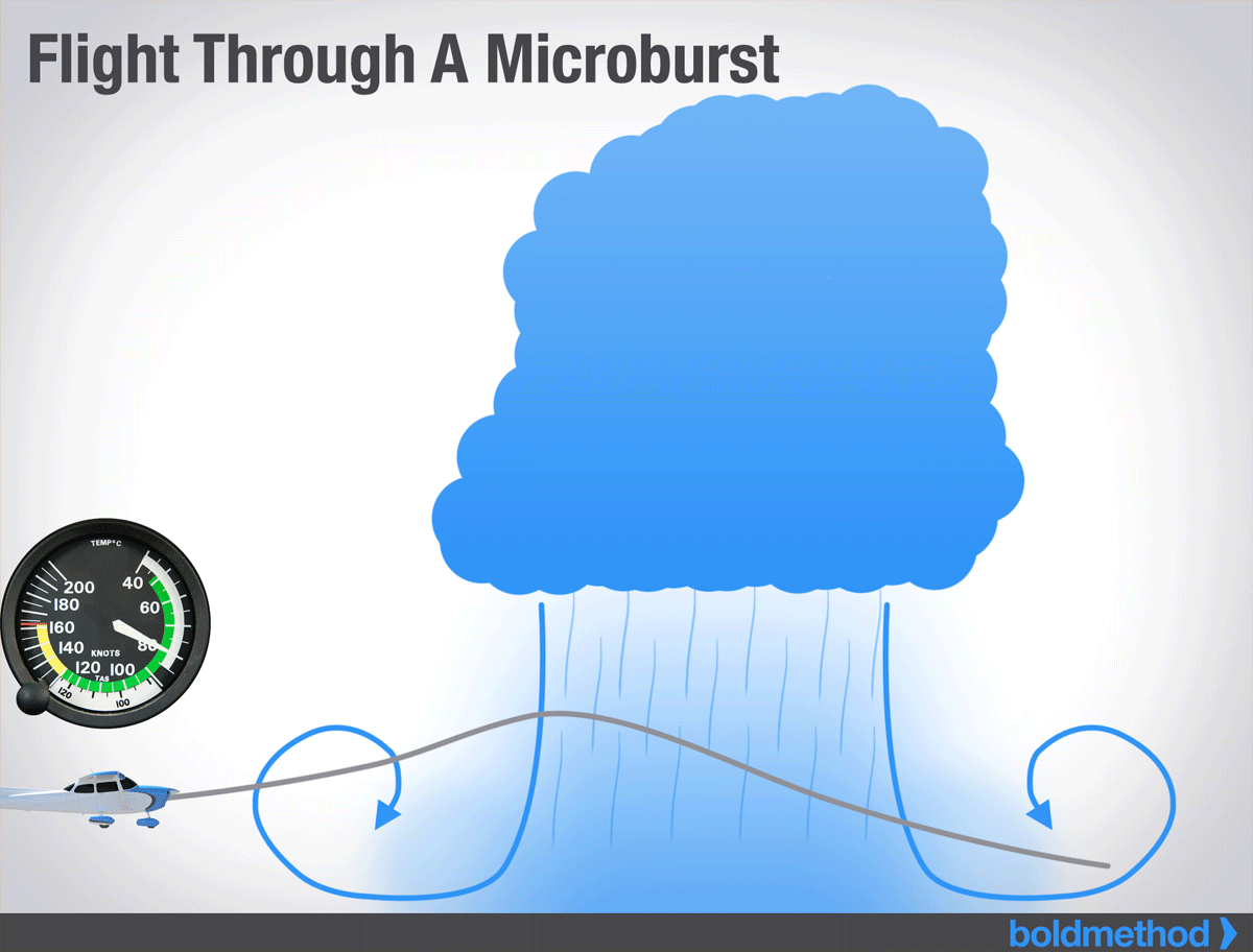 downburst란 thunderstorm mature stage 에서 형성된 강한 하강기류로 강풍을 이야기 한다. 이 다운버스트는 강한 하강기류 때문에 조종사에게 특별한 주의를 요구한다. 하강기류가 지표에 닿으면 양쪽으로 퍼져나가는 성질이 있다.