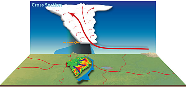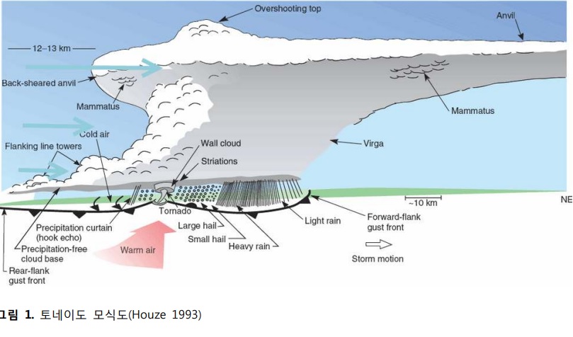 토네이도는 슈퍼셀 thunderstorm이 있는 저기압 지역에서 주로 발생한다.