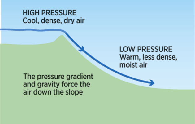 - 고지대의 매우 높은 밀도의 찬공기가 상대적으로 저압지역인 아래로 하강하면서 따뜻해진다.