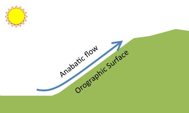 - anabatic wind는 활승바람으로 , 낮은 고도의 공기가 solar radiation으로 인해 산이나 고도가 높은 지형을 타고 올라가는 바람이다.